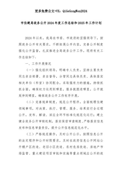 【七哥公文】2025年:市住建局政务公开2024年度工作总结和2025年工作计划+更多免费公文+VX:QiGeGongWen2024+更多免费公文+VX:QiGeGongWen2024