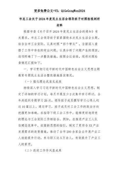 【七哥公文】2025年:市总工会关于2024年度民主生活会领导班子对照检视剖析材料+更多免费公文+VX:QiGeGongWen2024+更多免费公文+VX:QiGeGongWen2024