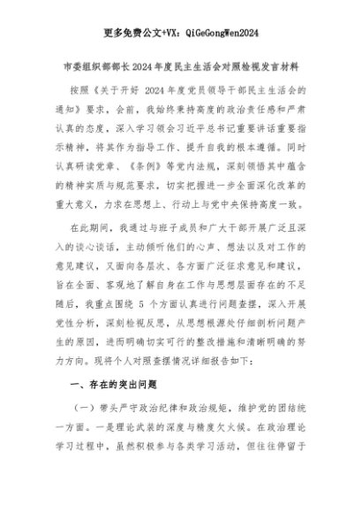 【七哥公文】2025年:市委组织部部长2024年度民主生活会对照检视发言材料+更多免费公文+VX:QiGeGongWen2024+更多免费公文+VX:QiGeGongWen2024