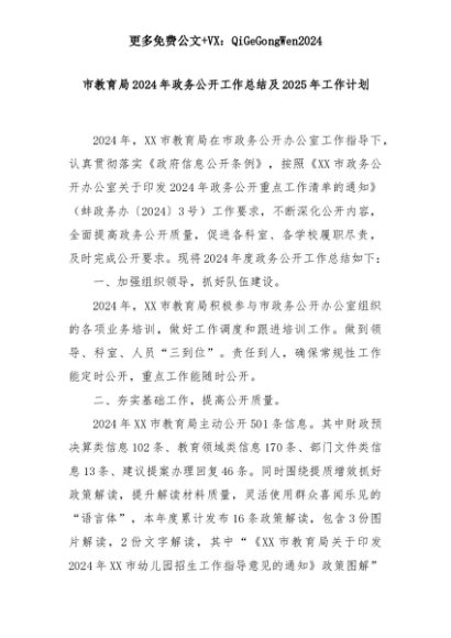 【七哥公文】2025年:市教育局2024年政务公开工作总结及2025年工作计划+更多免费公文+VX:QiGeGongWen2024+更多免费公文+VX:QiGeGongWen2024