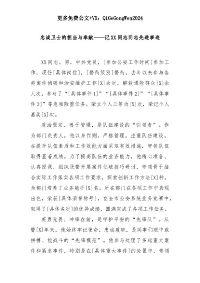 【七哥公文】2025年:忠诚卫士的担当与奉献——记XX同志同志先进事迹+更多免费公文+VX:QiGeGongWen2024+更多免费公文+VX:QiGeGongWen2024