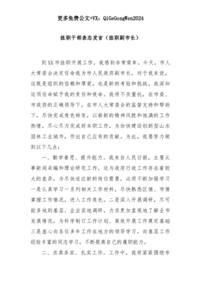 【七哥公文】2025年:挂职干部表态发言(挂职副市长)+更多免费公文+VX:QiGeGongWen2024+更多免费公文+VX:QiGeGongWen2024