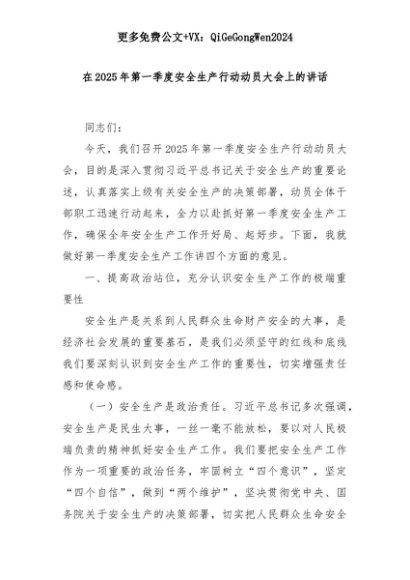 【七哥公文】2025年:在2025年第一季度安全生产行动动员大会上的讲话+更多免费公文+VX:QiGeGongWen2024+更多免费公文+VX:QiGeGongWen2024