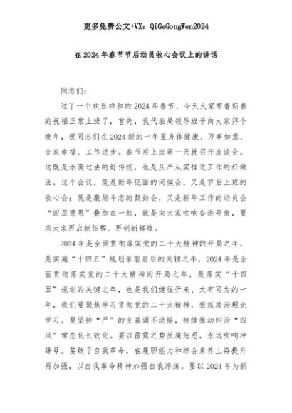 【七哥公文】2025年:在2024年春节节后动员收心会议上的讲话+更多免费公文+VX:QiGeGongWen2024+更多免费公文+VX:QiGeGongWen2024