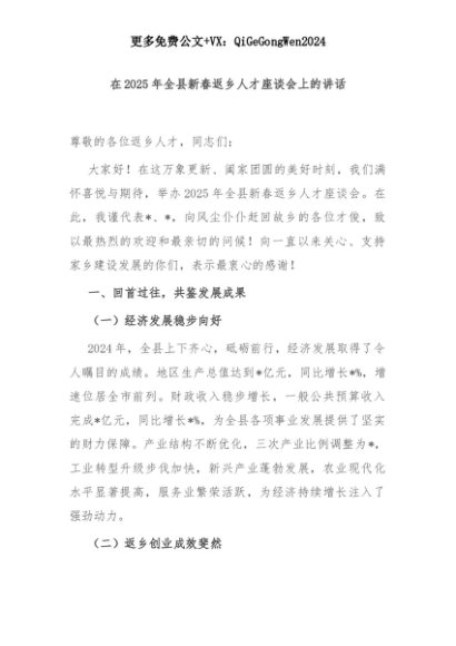 【七哥公文】2025年:在2025年全县新春返乡人才座谈会上的讲话+更多免费公文+VX:QiGeGongWen2024+更多免费公文+VX:QiGeGongWen2024