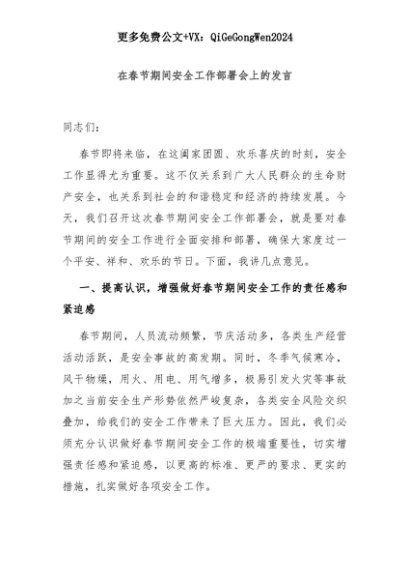 【七哥公文】2025年:在春节期间安全工作部署会上的发言+更多免费公文+VX:QiGeGongWen2024+更多免费公文+VX:QiGeGongWen2024
