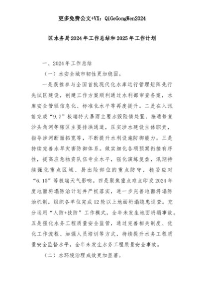 【七哥公文】2025年:区水务局2024年工作总结和2025年工作计划+更多免费公文+VX:QiGeGongWen2024+更多免费公文+VX:QiGeGongWen2024