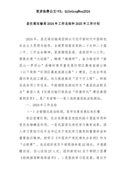 【七哥公文】2025年:县交通运输局2024年工作总结和2025年工作计划+更多免费公文+VX:QiGeGongWen2024+更多免费公文+VX:QiGeGongWen2024