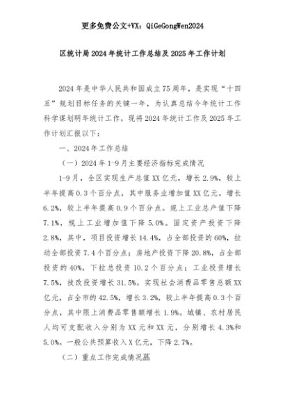 【七哥公文】2025年:区统计局2024年统计工作总结及2025年工作计划+更多免费公文+VX:QiGeGongWen2024+更多免费公文+VX:QiGeGongWen2024