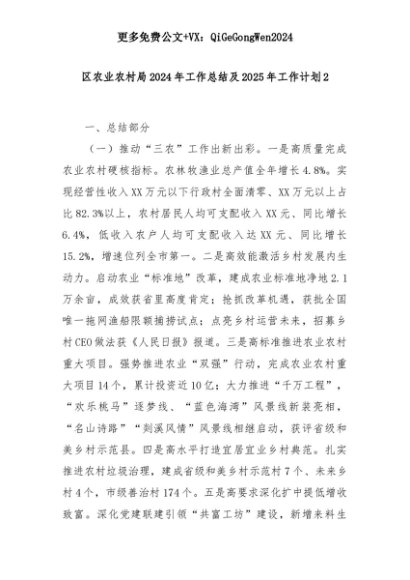 【七哥公文】2025年:区农业农村局2024年工作总结及2025年工作计划2+更多免费公文+VX:QiGeGongWen2024+更多免费公文+VX:QiGeGongWen2024