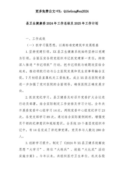 【七哥公文】2025年:县卫生健康委2024年工作总结及2025年工作计划+更多免费公文+VX:QiGeGongWen2024+更多免费公文+VX:QiGeGongWen2024