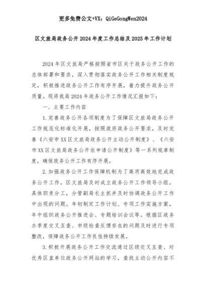 【七哥公文】2025年:区文旅局政务公开2024年度工作总结及2025年工作计划+更多免费公文+VX:QiGeGongWen2024+更多免费公文+VX:QiGeGongWen2024