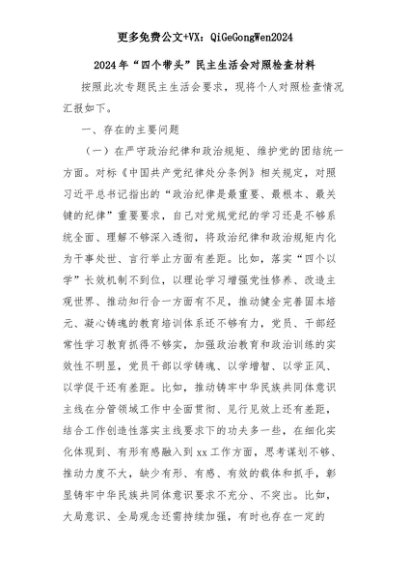 【七哥公文】2025年:2024年“四个带头”民主生活会对照检查材料+更多免费公文+VX:QiGeGongWen2024+更多免费公文+VX:QiGeGongWen2024