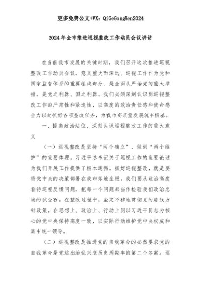 【七哥公文】2025年:2024年全市推进巡视整改工作动员会议讲话+更多免费公文+VX:QiGeGongWen2024+更多免费公文+VX:QiGeGongWen2024