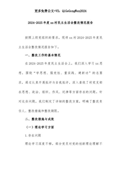 【七哥公文】2025年:2024 - 2025年度xx村民主生活会整改情况报告+更多免费公文+VX:QiGeGongWen2024+更多免费公文+VX:QiGeGongWen2024
