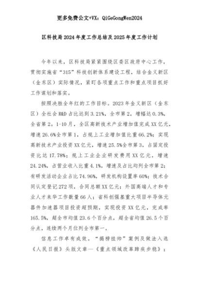 【七哥公文】2025年:区科技局2024年度工作总结及2025年度工作计划+更多免费公文+VX:QiGeGongWen2024+更多免费公文+VX:QiGeGongWen2024