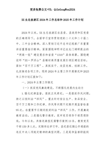 【七哥公文】2025年:XX生态旅游区2024年工作总结和2025年工作计划+更多免费公文+VX:QiGeGongWen2024+更多免费公文+VX:QiGeGongWen2024