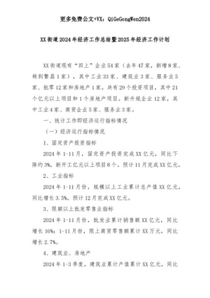 【七哥公文】2025年:XX街道2024年经济工作总结暨2025年经济工作计划+更多免费公文+VX:QiGeGongWen2024+更多免费公文+VX:QiGeGongWen2024