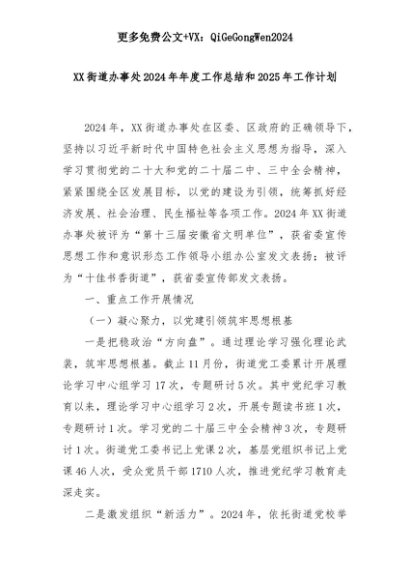 【七哥公文】2025年:XX街道办事处2024年年度工作总结和2025年工作计划+更多免费公文+VX:QiGeGongWen2024+更多免费公文+VX:QiGeGongWen2024