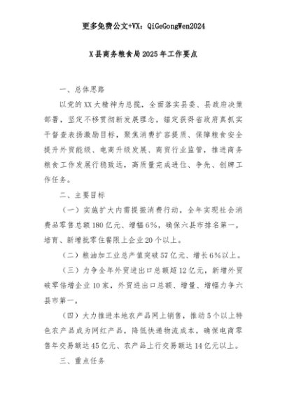 【七哥公文】2025年:X县商务粮食局2025年工作要点+更多免费公文+VX:QiGeGongWen2024+更多免费公文+VX:QiGeGongWen2024