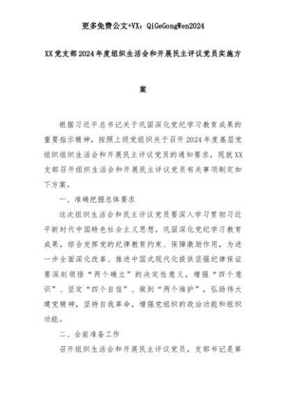 【七哥公文】2025年:XX党支部2024年度组织生活会和开展民主评议党员实施方案+更多免费公文+VX:QiGeGongWen2024+更多免费公文+VX:QiGeGongWen2024