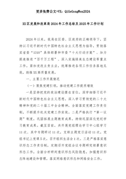 【七哥公文】2025年:XX区发展和改革局2024年工作总结及2025年工作计划+更多免费公文+VX:QiGeGongWen2024+更多免费公文+VX:QiGeGongWen2024