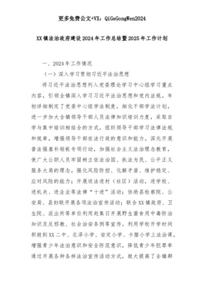 【七哥公文】2025年:XX镇法治政府建设2024年工作总结暨2025年工作计划+更多免费公文+VX:QiGeGongWen2024+更多免费公文+VX:QiGeGongWen2024