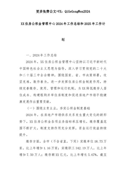 【七哥公文】2025年:XX住房公积金管理中心2024年工作总结和2025年工作计划+更多免费公文+VX:QiGeGongWen2024+更多免费公文+VX:QiGeGongWen2024