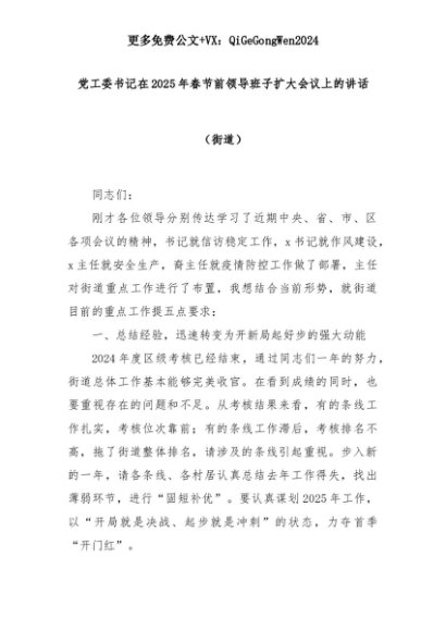 【七哥公文】2025年:党工委书记在2025年春节前领导班子扩大会议上的讲话(街道)+更多免费公文+VX:QiGeGongWen2024+更多免费公文+VX:QiGeGongWen2024