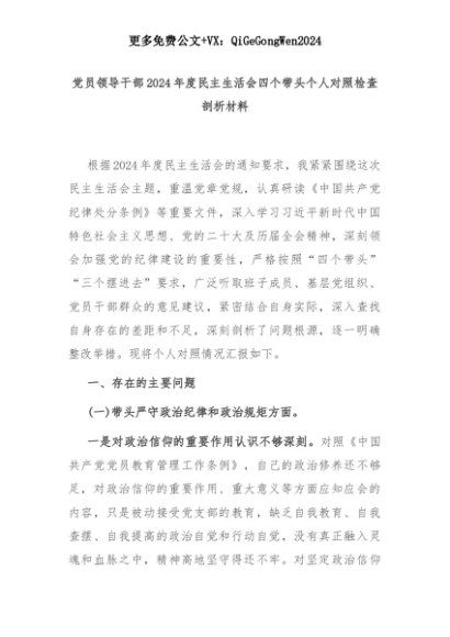 【七哥公文】2025年:党员领导干部2024年度民主生活会四个带头个人对照检查剖析材料+更多免费公文+VX:QiGeGongWen2024+更多免费公文+VX:QiGeGongWen2024