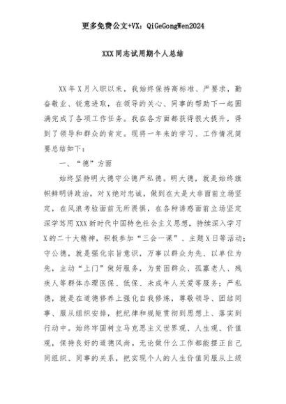 【七哥公文】2025年:XXX同志试用期个人总结+更多免费公文+VX:QiGeGongWen2024+更多免费公文+VX:QiGeGongWen2024