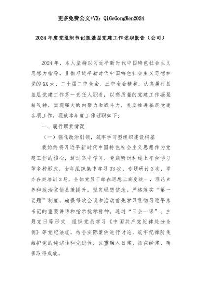 【七哥公文】2025年:2024年度党组织书记抓基层党建工作述职报告(公司)+更多免费公文+VX:QiGeGongWen2024+更多免费公文+VX:QiGeGongWen2024