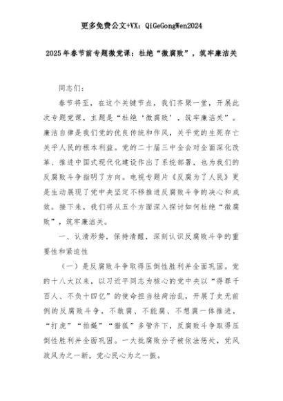 【七哥公文】2025年:2025年春节前专题微党课:杜绝“微腐败”,筑牢廉洁关+更多免费公文+VX:QiGeGongWen2024+更多免费公文+VX:QiGeGongWen2024