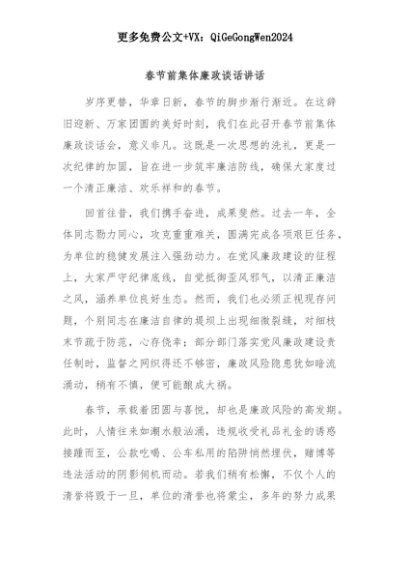 【七哥公文】2025年:春节前集体廉政谈话讲话+更多免费公文+VX:QiGeGongWen2024+更多免费公文+VX:QiGeGongWen2024