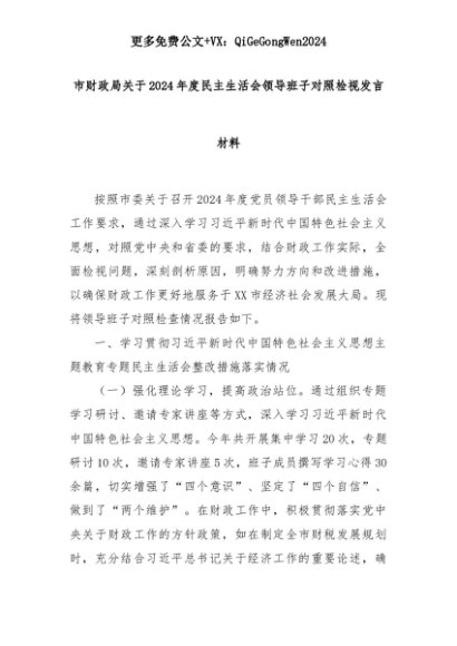 【七哥公文】2025年:市财政局关于2024年度民主生活会领导班子对照检视发言材料+更多免费公文+VX:QiGeGongWen2024+更多免费公文+VX:QiGeGongWen2024