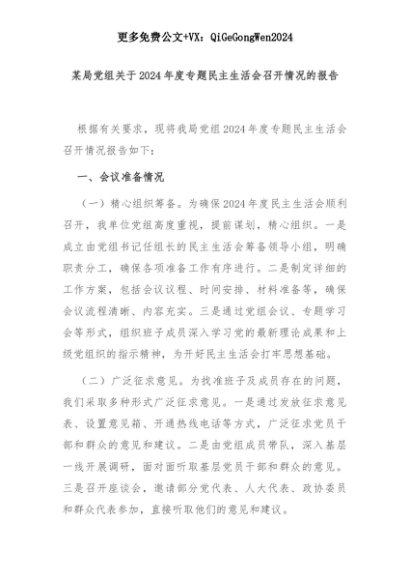 【七哥公文】2025年:某局党组关于2024年度专题民主生活会召开情况的报告+更多免费公文+VX:QiGeGongWen2024+更多免费公文+VX:QiGeGongWen2024