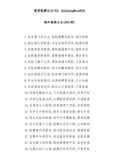 【七哥公文】2025年:(200例)蛇年春联大全+更多免费公文+VX:QiGeGongWen2024+更多免费公文+VX:QiGeGongWen2024