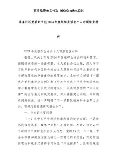 【七哥公文】2025年:某某社区党委副书记2024年度组织生活会个人对照检查材料+更多免费公文+VX:QiGeGongWen2024+更多免费公文+VX:QiGeGongWen2024