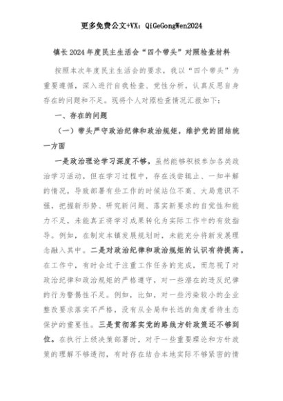 【七哥公文】2025年:镇长2024年度民主生活会“四个带头”对照检查材料+更多免费公文+VX:QiGeGongWen2024+更多免费公文+VX:QiGeGongWen2024