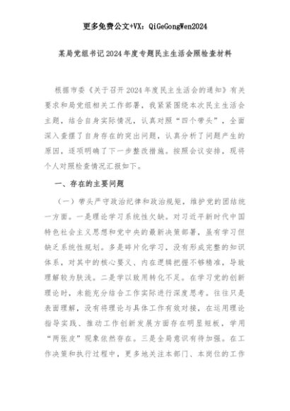 【七哥公文】2025年:某局党组书记2024年度专题民主生活会照检查材料+更多免费公文+VX:QiGeGongWen2024+更多免费公文+VX:QiGeGongWen2024