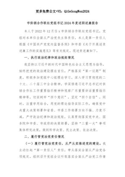 【七哥公文】2025年:市供销合作联社党组书记2024年度述职述廉报告+更多免费公文+VX:QiGeGongWen2024+更多免费公文+VX:QiGeGongWen2024