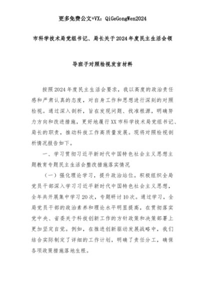【七哥公文】2025年:市科学技术局党组书记、局长关于2024年度民主生活会领导班子对照检视发言材料+更多免费公文+VX:QiGeGongWen2024+更多免费公文+VX:QiGeGongWen2024