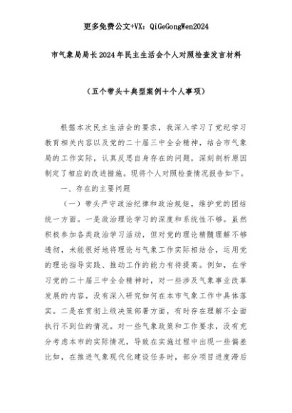 【七哥公文】2025年:市气象局局长2024年民主生活会个人对照检查发言材料(五个带头+典型案例+个人事项)+更多免费公文+VX:QiGeGongWen2024+更多免费公文+VX:QiGeGongWen2024
