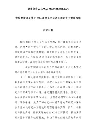 【七哥公文】2025年:市科学技术局关于2024年度民主生活会领导班子对照检视发言材料+更多免费公文+VX:QiGeGongWen2024+更多免费公文+VX:QiGeGongWen2024