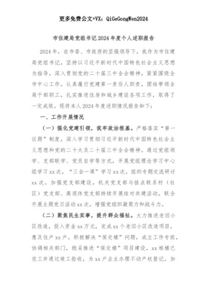 【七哥公文】2025年:市住建局党组书记2024年度个人述职报告+更多免费公文+VX:QiGeGongWen2024+更多免费公文+VX:QiGeGongWen2024