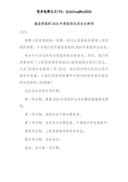 【七哥公文】2025年:基层党组织2024年度组织生活会主持词+更多免费公文+VX:QiGeGongWen2024+更多免费公文+VX:QiGeGongWen2024