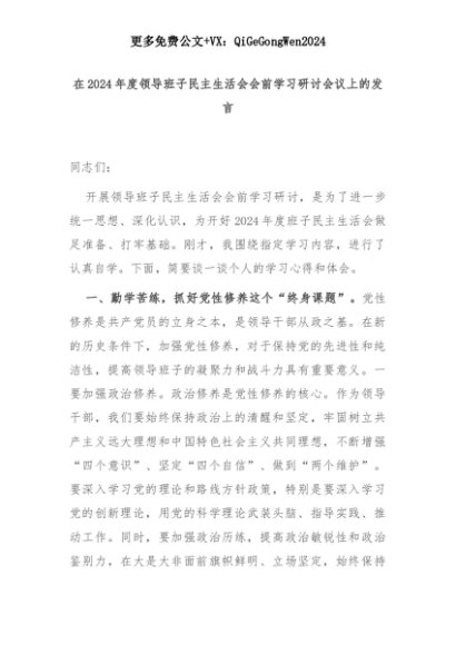 【七哥公文】2025年:在2024年度领导班子民主生活会会前学习研讨会议上的发言+更多免费公文+VX:QiGeGongWen2024+更多免费公文+VX:QiGeGongWen2024