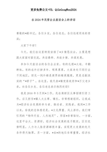 【七哥公文】2025年:在2024年民营企业座谈会上的讲话+更多免费公文+VX:QiGeGongWen2024+更多免费公文+VX:QiGeGongWen2024
