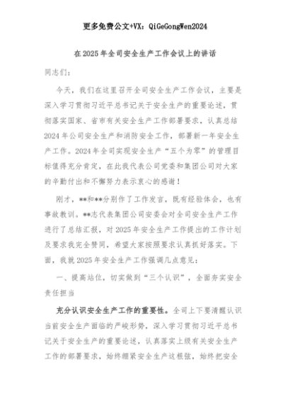 【七哥公文】2025年:在2025年全司安全生产工作会议上的讲话+更多免费公文+VX:QiGeGongWen2024+更多免费公文+VX:QiGeGongWen2024