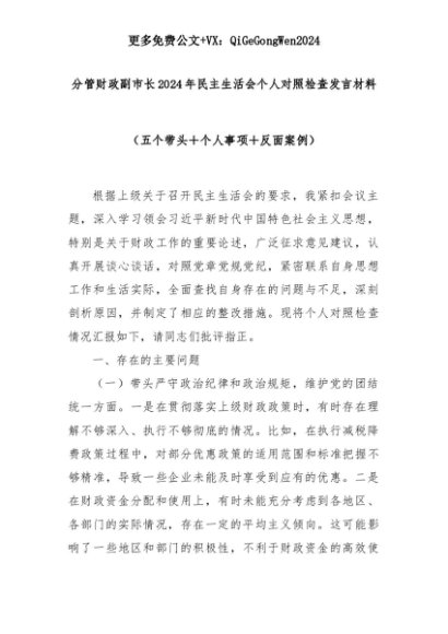 【七哥公文】2025年:分管财政副市长2024年民主生活会个人对照检查发言材料(五个带头+个人事项+反面案例)+更多免费公文+VX:QiGeGongWen2024+更多免费公文+VX:QiGeGongWen2024